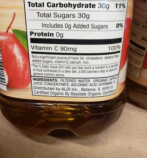Nutritional contents of apple juice. About 110–120 calories, 28g of carbohydrates (mainly fructose/glucose sugars), 0.15g of protein, and very little...