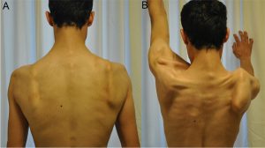 The Latin word for shoulder blade in anatomy is scapulo. The muscles that stabilize your shoulder blades are weakened by FSHD. Your shoulder blades resemble wings because they protrude and move up toward your neck as you move them. This is referred to by providers as scapular winging.