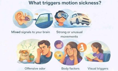 Motion sickness triggers. The symptoms of motion sickness, sometimes referred to as travel sickness, include nausea, vomiting, lightheadedness, and perspiration. It happens when a person is...
